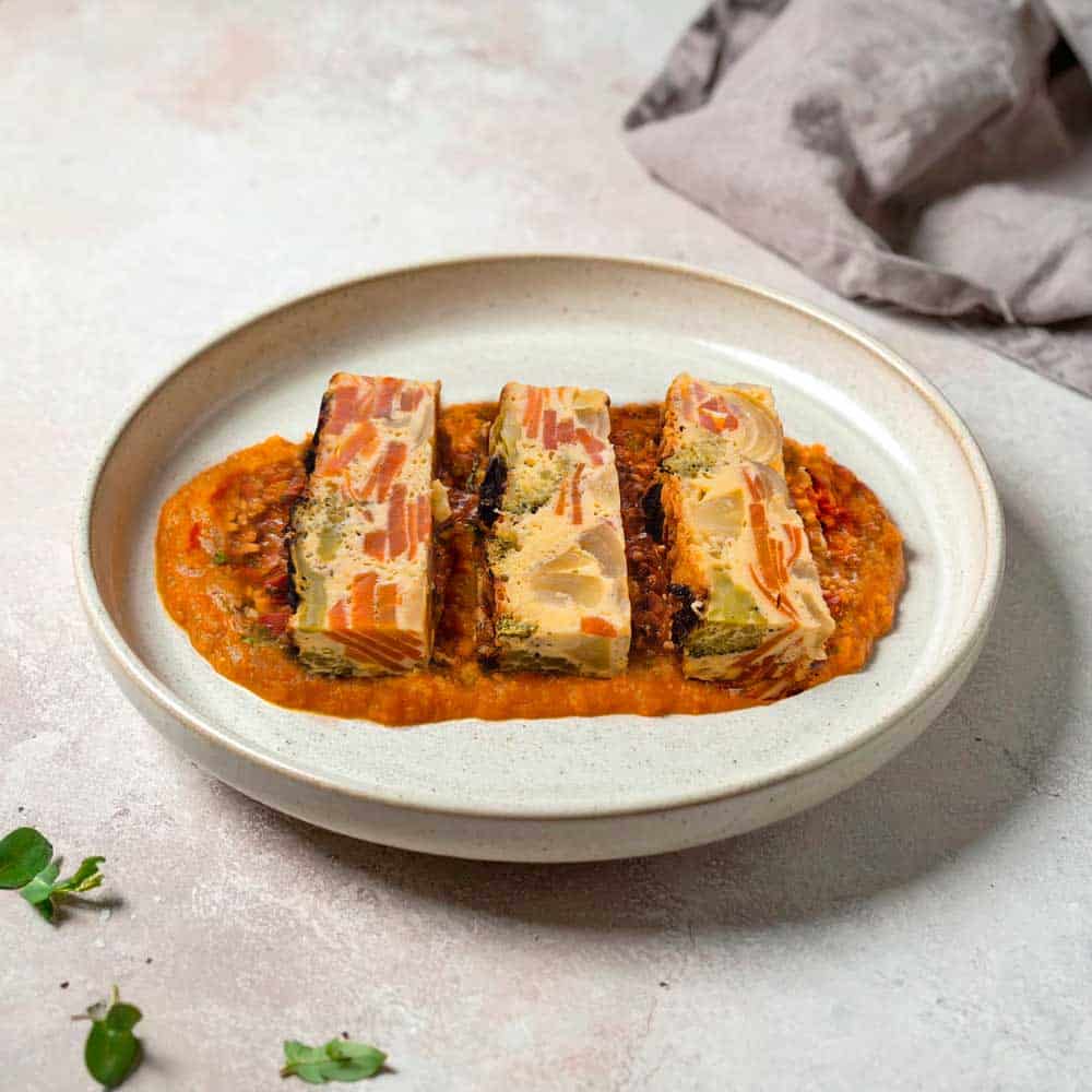Grønsagsterrine smager himmelsk sammen med den let krydrede Romescosauce – en tomatsauce med mandler og nødder