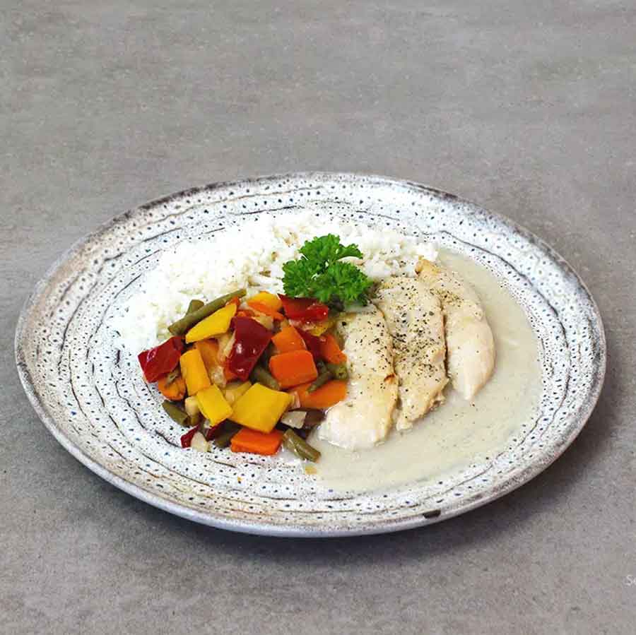 Kyllingekødet får vi leveret fra Rokkedahl kyllinger ca 10 minutters kørsel fra os. Kyllinge brystkød velkrydret med ingefær, citron og tamari, og hertil en god ingefærsauce med kokosmælk, og serveret med kartofler og grønsager med bid i.