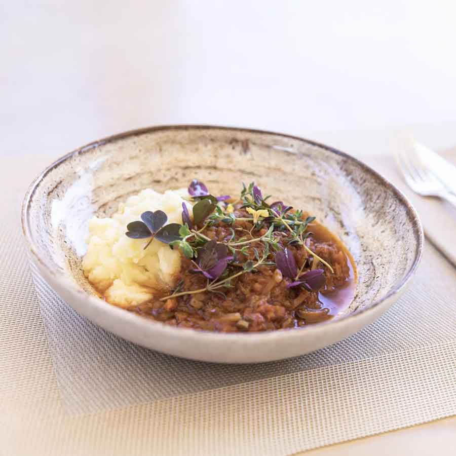 Denne meget smagfulde gryderet er fyldt med saft og kraft fra champignon, gulerødder og selleri, fyldighed fra tomatpuré og fløde og smag fra laurbærblade, ribssaft og soja. Hertil vores gode kartoffelmos som er proteinberiget med hestebønner. Virkelig en ret som vi er stolte af.